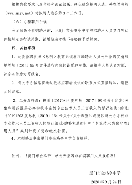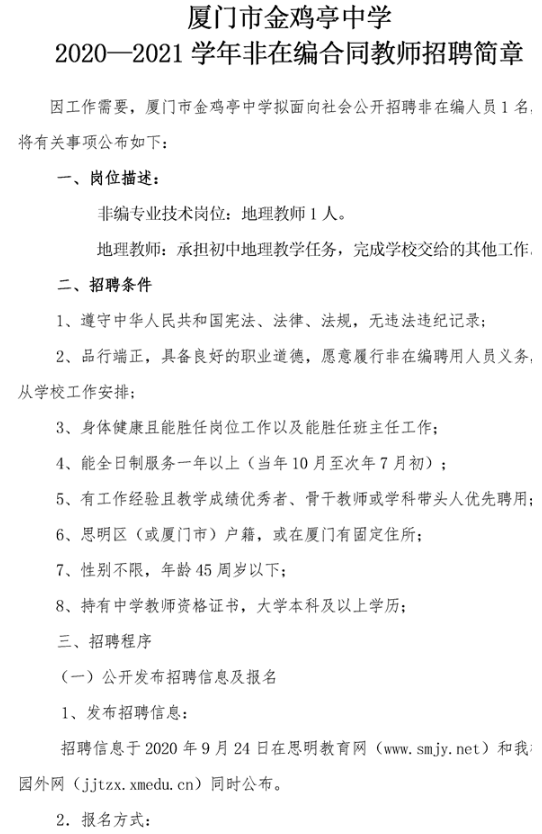 2020廈門教師招聘 廈門市金雞亭中學2020—2021學年非在編合同教師招聘簡章(地理1人)