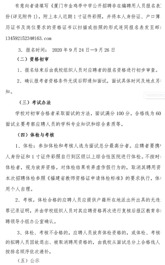 2020廈門教師招聘 廈門市金雞亭中學2020—2021學年非在編合同教師招聘簡章(地理1人) 文武教師溫馨提示:近期文武教師網收到舉報,有詐騙分子發布虛假信息,進行騙取報名費,如信息中涉及報名收費,請各位老師謹慎鑒別,確認無誤后再繳費報名,以免上當受騙,一般教育局組織的招聘才需要支付費用,學校招聘不需要支付,文武網所提供的所有考試信息僅供參考,敬請考生以權威部門公布的正式信息為準。 歡迎加入福建教師招聘群:369245610,考情、招聘信息早知道!