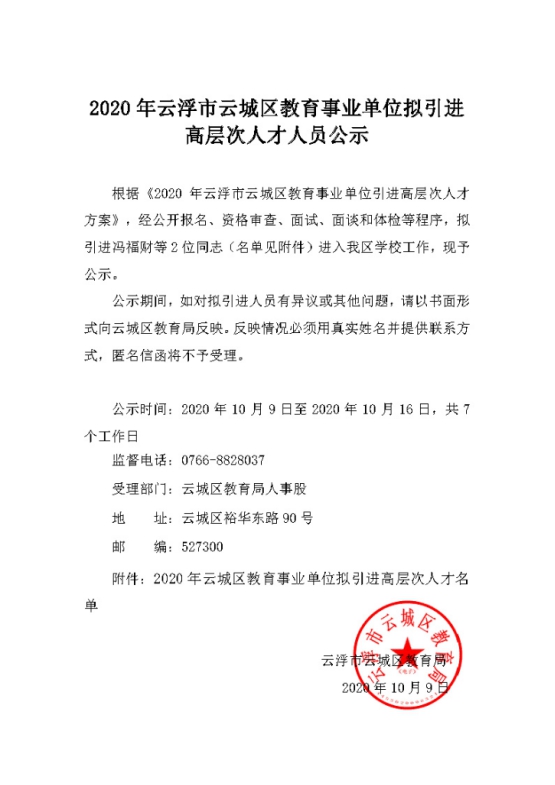 廣東云浮市云城區(qū)教育事業(yè)單位2020年擬引進(jìn)高層次人才名單公示