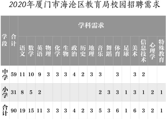 2020年廈門教師招聘 福建廈門海滄區教育局校園招聘編內教師公告【90人】