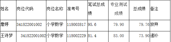 因體檢、考察環(huán)節(jié)小學數(shù)學崗位(341822001002)一名考生自動放棄,根據(jù)《2020年度安徽省廣德市中小學新任教師公開招聘公告》規(guī)定進行等額遞補,現(xiàn)將放棄和遞補人員名單予以公告。