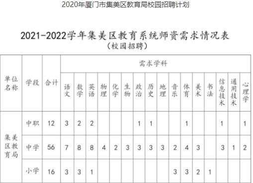 2020福建廈門集美區教育局校園編內教師招聘公告【84人】