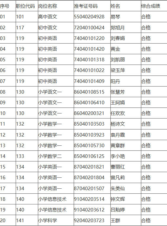 2020年桂陽縣公開招聘教師遞補體檢工作已結(jié)束。現(xiàn)對體檢合格人員予以公告,名單如下: