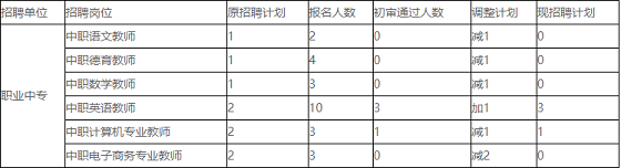 2020年菏澤市定陶區(qū)教體系統(tǒng)第二批公開招聘教師報名工作于2020年11月9日17:00截止。目前,已完成報名資格初審,并通過應(yīng)聘人員報名郵箱通知初審結(jié)果。因報名人數(shù)不足造成中職語文、中職德育、中職數(shù)學(xué)、中職電子商務(wù)專業(yè)教師崗位空缺,按照公告要求,現(xiàn)將部分招聘崗位調(diào)整情況公告如下: