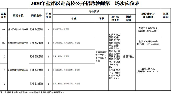 根據《2020年鹽都區赴高校公開招聘教師公告》規定,現將第二場次崗位公告如下,具體見《2020年鹽都區赴高校公開招聘教師第二場次崗位表》。