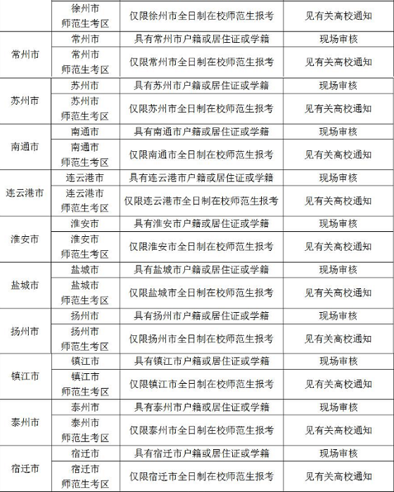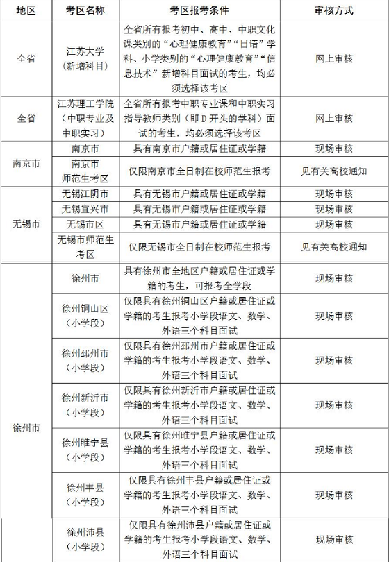 4.江蘇省內就讀的全日制在校本專科師范生和全日制教育碩士選擇院校所在地的師范生考區為應試考區。全省報考中職專業課和中職實習指導教師面試的考生(含師范生)統一選則江蘇理工學院考區,全省報考新增科目面試的考生(含師范生)統一選擇江蘇大學考區。