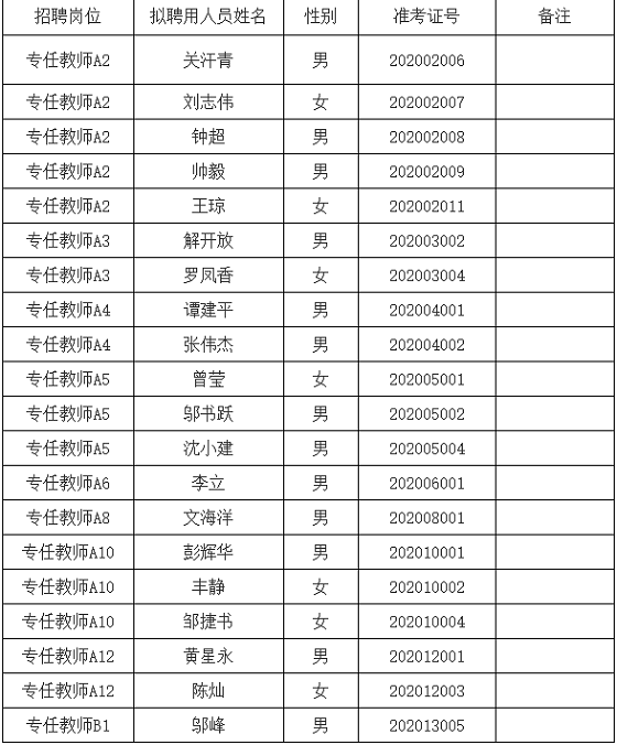 根據(jù)《湖南工程學院2020年第二批專任教師公開招聘公告》及有關規(guī)定,經(jīng)報名、資格審查、直接考核、體檢、考察等程序,經(jīng)湖南工程學院校長辦公會、黨委會研究決定,確定關汗青等20名同志為2020年湖南工程學院第二批專任教師公開招聘擬聘用人選,現(xiàn)予以公示。