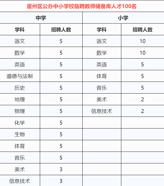 面向社會公開招考公辦中小學校臨聘教師儲備庫人才100名。招聘的具體崗位詳見《2020年三亞市崖州區公辦中小學校臨聘教師儲備庫人才崗位職數表》(見附件1)。