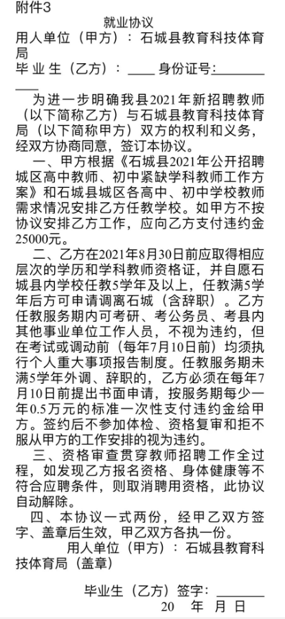 2.報經縣研究同意聘用后,與縣教育科技體育局簽訂在縣任教服務不少于5學年的聘用協議,如任教未滿5學年外調、辭職的,須按聘用協議承擔相應的違約責任。由有關部門按規定辦理聘用、調動、入編等相關手續。聘用時按規定實行試用期。