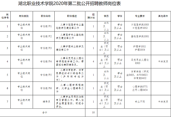 湖北職業技術學院2020年第二批公開招聘教師崗位表