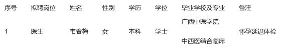 根據《廣西壯族自治區事業單位公開招聘人員實施辦法》(桂人社發〔2011〕155號)、《關于進一步規范區直事業單位公開招聘工作的通知》(桂人社辦發〔2013〕135號)和《廣西安全工程職業技術學院2020年度公開招聘非實名人員控制數公告》等文件精神,通過筆試、面試、考核、體檢等程序,經學院黨委研究決定,經學院黨委研究決定,擬確定韋春梅同志為聘用人選,現將人員基本情況予以公示,公示期為7個工作日(2020年12月24日至2021年1月4日)。