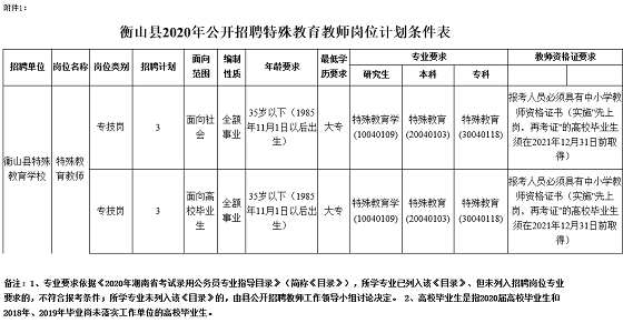 1.衡山縣2020年公開招聘特殊教育教師崗位計劃條件表