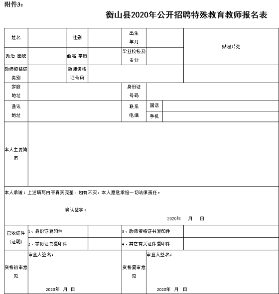 3.衡山縣2020年公開招聘特殊教育教師報名表