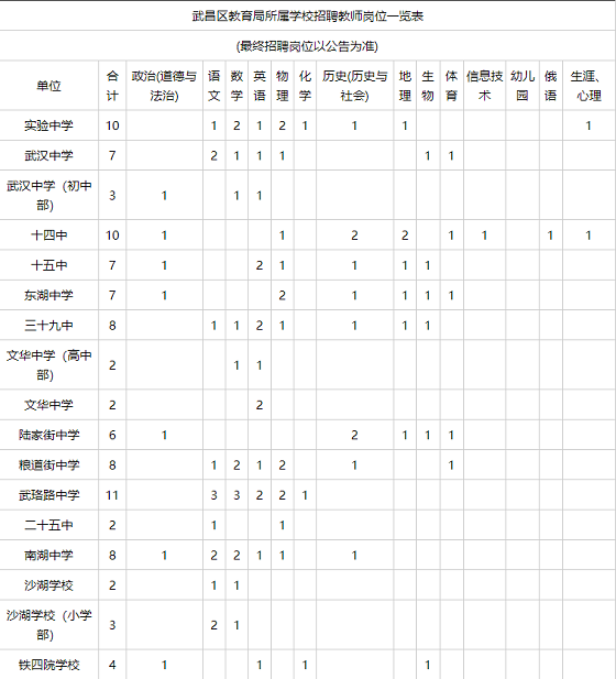武昌區教育局所屬學校招聘教師崗位一覽表(最終招聘崗位以公告為準)