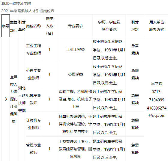 附件:湖北三峽技師學院2021年急需緊缺人才引進崗位表