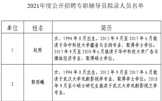 根據華中科技大學2021年度公開招聘專職輔導員啟事,經個人報名、資格審查、筆試、面試和用人單位考察等程序,確定趙照等2人為擬錄人選,現予以公示。公示期間,如對公示對象有異議,請向我單位反映。
