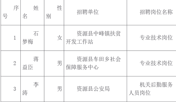 現將資源縣事業單位2020年度直接面試公開招聘人員名單(3人)公示如下,公示期為7個工作日。如有異議,請于2021年2月2日前,以書面形式署真實姓名向資源縣人社局專業技術人員管理股反映。聯系電話:0773-4366983、0773-4366636