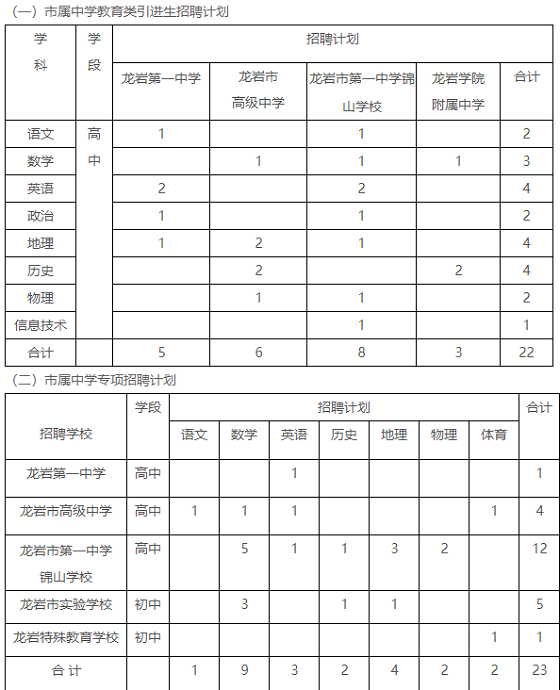 詳見龍巖市教育局網(wǎng)站2021年1月18日發(fā)布的《福建省龍巖市市屬中小學2021年第二次教育類引進生及優(yōu)秀高校畢業(yè)生專項招聘公告》(網(wǎng)址鏈接:http://jyj.longyan.gov.cn/zwgk/jyyw/202101/t20210118_1758790.htm)。
