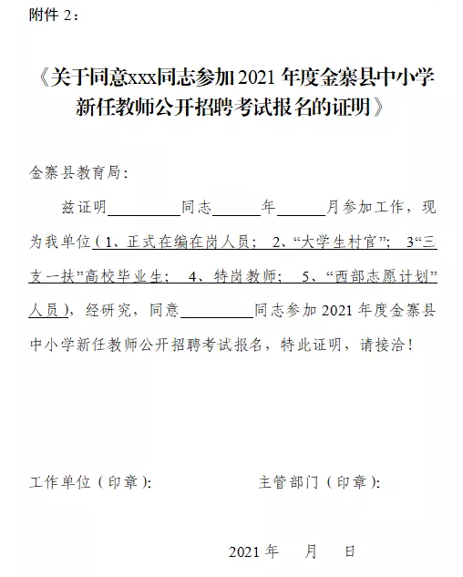 4.機關、事業單位在編正式工作人員(含服務期特崗教師)須按干部人事管理權限提供單位和主管部門同意報考的證明。同意報考證明式樣詳見附件2:《關于同意ⅹⅹⅹ同志參加2021年度金寨縣中小學新任教師公開招聘考試報名的證明》。