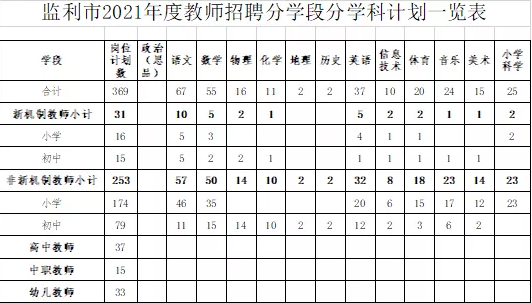 為加快監利教育事業的發展,我市2021年擬面向社會公開招聘公辦教師369名。其中,高中教師37名、初中教師94名(新機制15名、自主招聘79名)、小學教師190名(新機制16名、自主招聘174名)、幼師33名、中職教師15名。招聘崗位初步設置如下: