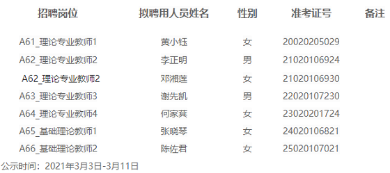 據《2020年株洲市市直事業單位公開招聘(選調)工作人員公告》要求,通過網上報名、資格初審、筆試、資格復審、面試、試講、體檢、考察等環節,經公開招聘工作領導小組研究,確定黃小鈺等7名同志為擬聘用人員,現予以公示。