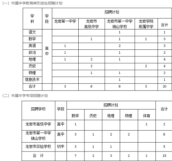 (一)市屬中學(xué)教育類(lèi)引進(jìn)生:詳見(jiàn)龍巖市教育局官網(wǎng)《龍巖市2021年教育類(lèi)引進(jìn)生招聘公告》,網(wǎng)址鏈接:http://jyj.longyan.gov.cn/zwgk/jyyw/202103/t20210308_1768890.htm。