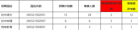 懷遠縣2021年招聘中小學新任教師考試報名經過網上資格初審和繳費確認,現有三個招聘崗位達不到開考比例被核減,具體核減計劃情況見下表。