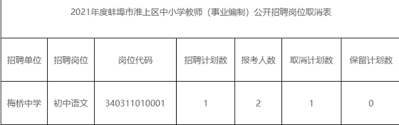 根據(jù)《2021年度蚌埠市淮上區(qū)中小學(xué)教師(事業(yè)編制)公開招聘公告》要求,經(jīng)前期網(wǎng)上報(bào)名、資格初審和繳費(fèi)確認(rèn),有1個(gè)崗位達(dá)不到開考比例被取消,現(xiàn)予以公布(詳見附件)。