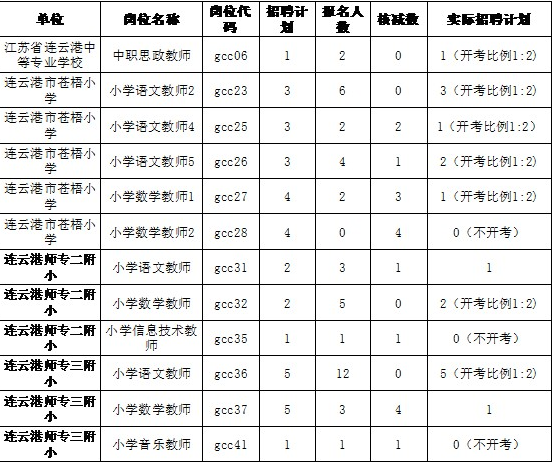 根據《連云港市教育局直屬學校2021年公開招聘編制內高層次人才公告》規定,招聘人數與報名人數的比例達不到1:3,核減招聘崗位數,直至不予開考;部分崗位因專業緊缺,經招聘單位申請,報連云港市公開招聘綜合管理部門審核降低開考比例,現將有關崗位公告如下: