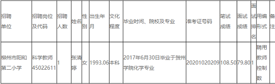 根據(jù)《2020年度柳州市本級(jí)中小學(xué)教師公開招聘簡(jiǎn)章》要求及安排,張清婷同志考核合格,但因懷孕延期體檢。體檢結(jié)果為合格,擬聘用張清婷同志為柳州市陽和第二小學(xué)科學(xué)教師,現(xiàn)予以公示,公示期7個(gè)工作日(2021年3月17日至3月25日)。對(duì)擬聘用的同志如有異議,請(qǐng)以書面形式,并署真實(shí)姓名和聯(lián)系地址,于2021年3月23日前郵寄或直接送我單位(郵寄地址為:柳州市古亭大道100號(hào)冠亞•國(guó)際星城17棟3樓316室柳州市陽和工業(yè)新區(qū)社會(huì)事務(wù)局,郵編:545006,電話:0772-2875162),群眾如實(shí)反映有關(guān)問題受法律保護(hù)。