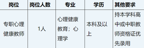 因?qū)W校教育教學(xué)發(fā)展需要,根據(jù)《福建省事業(yè)單位公開招聘人員暫行辦法》規(guī)定,晉江市晉興職業(yè)中專學(xué)校決定面向社會(huì)公開招聘一名專職心理健康教師,現(xiàn)將有關(guān)事項(xiàng)公告如下: