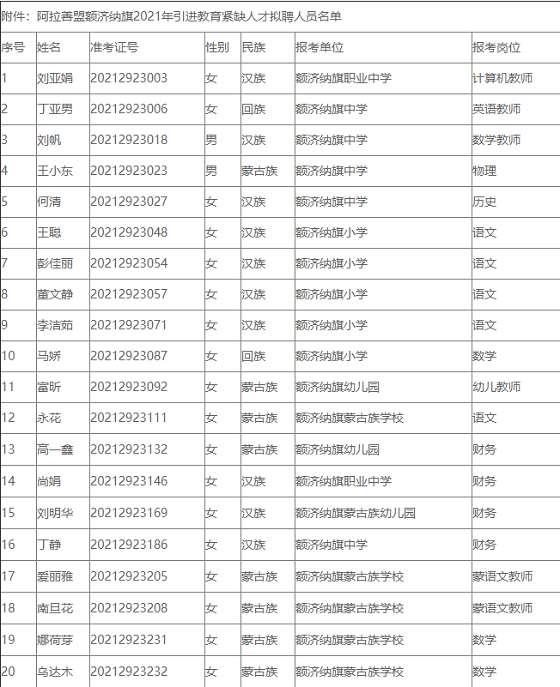 額濟納旗2021年引進教育緊缺人才已完成筆試、面試、體檢、考察等工作,按照《阿拉善盟額濟納旗2021年引進教育緊缺人才公告》要求,現將擬錄用人員名單進行公示(詳見附件),公示期自2021年3月24日—3月30日,共7天,公示期間如對擬聘用人員有異議,請反映相關情況。