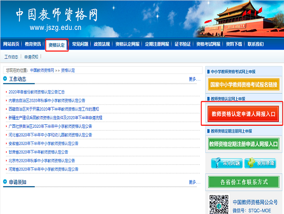 申請人登錄中國教師資格網(http://www.jszg.edu.cn),從教師資格認定申請人網報入口處進入(如下圖)。