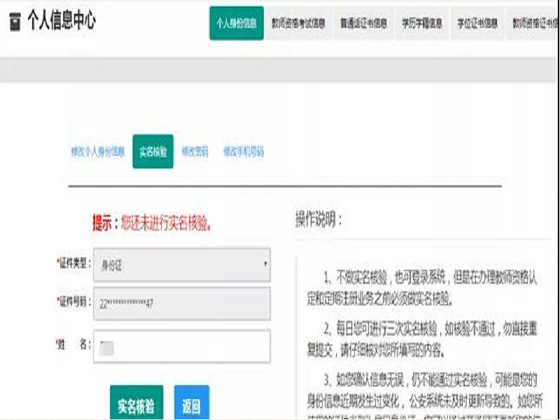 (1)憑已經獲得的學歷申請認定教師資格的考生,在“是否應屆畢業生”這一欄選“否”,輸入學歷證書編號,點擊“核驗”按鈕,系統將在中國高等教育學生信息網(學信網)信息管理系統中獲取相關信息。