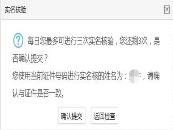 辦理后續業務之前,需先通過實名核驗,申請人每日最多可進行三次實名核驗,請勿隨意重復點擊。