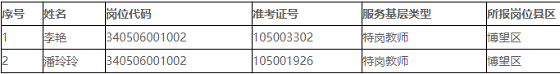 根據(jù)《2021年馬鞍山市博望區(qū)新任教師公開招聘公告》規(guī)定要求,經(jīng)博望區(qū)教師管理服務中心審核,現(xiàn)將符合2021年度馬鞍山市博望區(qū)新任教師公開招聘符合筆試加分條件的“服務基層項目”人員名單公示如下: