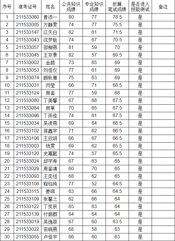一、報考幼兒教師Y01崗位進入技能測試名單及筆試成績(總計51人)