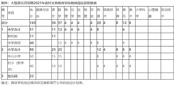 《大悟縣公開招聘2021年農村義務教育學校教師崗位及職數表》
