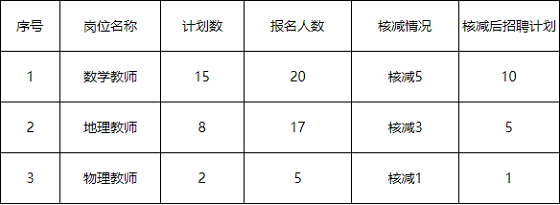 根據《2021年臨朐縣高中學校引進高層次優秀畢業生公告》規定:“招聘計劃與報名人數達不到規定面試比例的,按比例核減該崗位計劃,因此產生的空缺崗位計劃調整到其他緊缺專業崗位。”因高中數學、高中地理、高中物理教師崗位報名人數未達到規定面試比例,崗位核減情況如下。