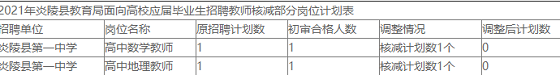 根據《株洲市炎陵縣2021年面向高校應屆畢業生招聘教師公告》,4月10日至4月12日進行了報名,現報名結束,部分崗位報名人數達不到規定的開考比例。經縣教育局公開招聘工作領導小組研究,決定核減高中數學崗位、高中地理崗位招聘計劃數各1個(詳見附件)。