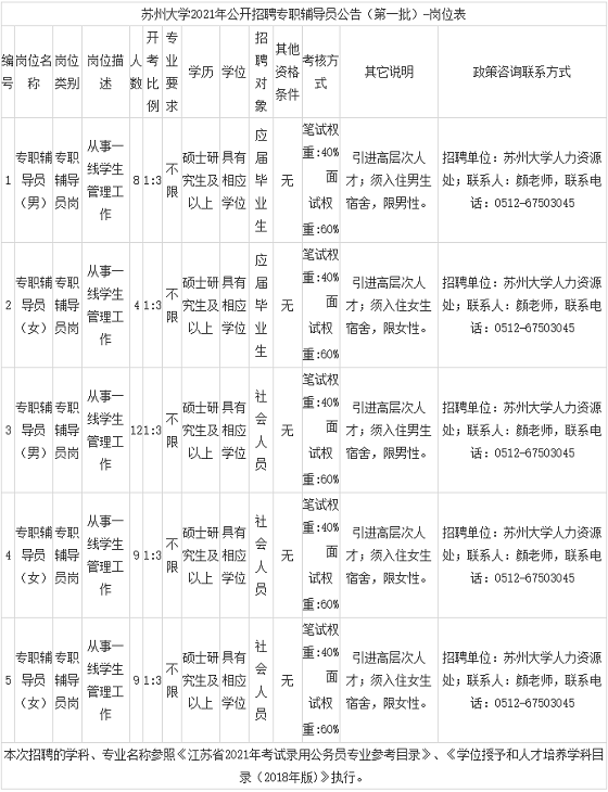 附件:蘇州大學2021年公開招聘專職輔導員公告(第一批)崗位表(附后)