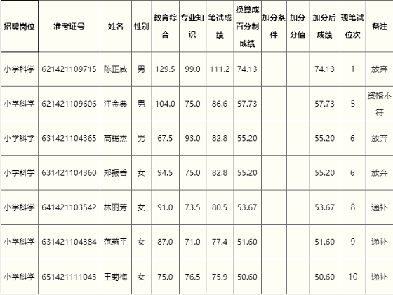 現將2021年7月21日新任教師補充招聘擬參加面試對象資格復核放棄及遞補對象公布如下,請遞補對象于7月21日下午3:00持相關材料到區教育局組織人事股(908室)進行資格復核,逾期視為自動放棄。面試資格審核提交材料及要求詳見荔城區人民政府教育專欄公告公示欄7月20日發布的《2021年荔城區新任教師補充招聘面試等有關事項通知》。