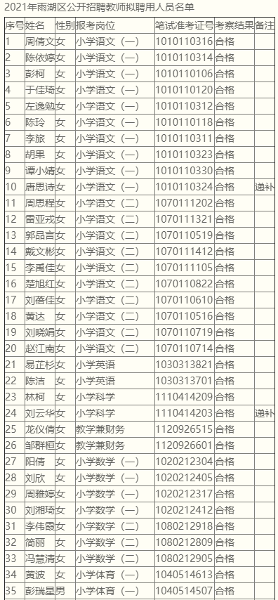 附:《2021年雨湖區公開招聘教師擬聘用人員名單》