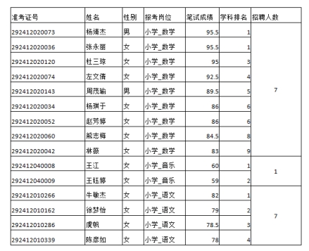 面試人員分崗位學科,按筆試成績從高到低,按不低于1:1.2的比例(進一法)確定,若最后一名筆試成績出現并列,并列人員一并進入面試。本次招聘進入面試32人,名單如下: