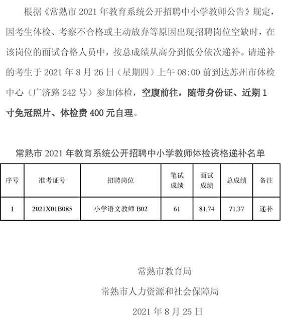 2021年江蘇蘇州常熟市教育系統公開招聘中小學教師體檢資格遞補公告(七)