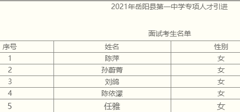 2021年岳陽縣第一中學專項人才引進公告面試考生名單