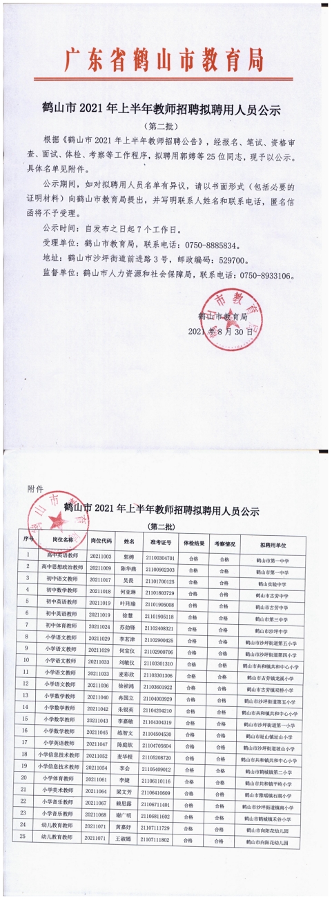 2021年上半年廣東江門鶴山市教師招聘擬聘用人員公示(第二批)