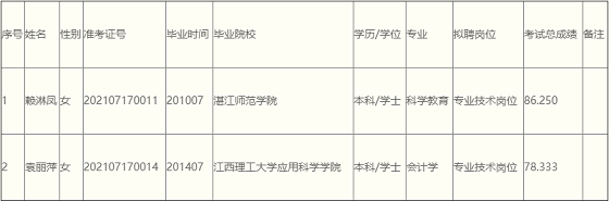 根據《2021年南雄市公開選聘小學教師及中小學專職衛生技術人員公告》,經宣傳動員、報名、資格審查、面試、體檢、考察等工作環節,賴淋鳳等2人符合崗位聘用條件,擬聘用賴淋鳳等2人為我市南雄市教育局下屬事業單位工作人員,現予公示,公示時間7個工作日(2021年9月24日——2021年10月8日),若有異議,請將意見署真名后投到南雄市教育局人事股(地址:南雄市林蔭西路35號,聯系電話:0751-3825197),請寫明聯系人姓名和聯系電話,匿名信函將不予受理。公示時間截止后反映的材料一律不予受理。