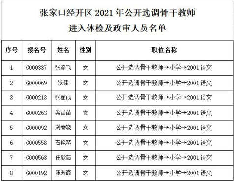根據《張家口經濟開發區2021年公開選調骨干教師公告》有關要求,小學教師崗位面試人數不足1:3比例的崗位,參照小學英語崗位錄取最低分數確定錄取分數線,中學教師崗位面試人數不足1:3比例的崗位,參照中學歷史崗位錄取最低分數確定錄取分數線,現將張家口經開區2021年公開選調骨干教師進入體檢及政審人員名單及有關注意事項通知如下: