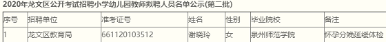 根據《2020年漳州市公開考試招聘中小學幼兒園新任教師方案》,經報名、考試、體檢、考核合格,擬聘謝曉玲同志為龍文區小學教師,現予以公示。公示期間,如有問題,請及時向龍文區教育局人事職改股和龍文區人力資源和社會保障局人力資源股反映。公示時間為自發布日起七個工作日。監督電話:0596-2638810、0596-6191170。